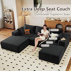 - 96" U-Shape Cloud Couch, Modern Modular Sectional L-Shape Sofa with Ottoman, Corduroy Upholstered Couches Deep Seat Sleeper Chaise Longue for Living Room, No Assembly Required(Black, Left Facing)