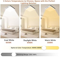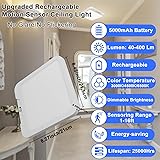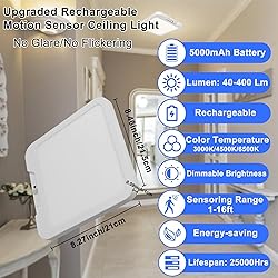 【 Rechargable Battery Ceiling Lights】: Ceiling light fixture wireless portable and rechargeable, the actual capacity of the battery is 5000Mah, with overload protection, also can greatly saves the subsequent use cost, 120° beam angle and a distance of 16 feet. 【Three Lighting Modes】 – The battery ceiling light offers three selectable modes: Always-On Mode, Daytime Mode, and Night Mode. You can switch between these modes by short-pressing the mode button, with Night Mode set as the default when powered on.Night Mode: The light activates only in low-light conditions (below 20 LUX) when motion is detected.Daytime Mode: The light turns on with motion detection even in bright environments.Always-On Mode: The light remains continuously on and must be turned off manually.In motion sensing mode, the light will automatically turn off 20 seconds after no motion is detected, ensuring a smarter, energy-efficient experience while saving power. 【Adjustable Color Temperature & Brightness】 – This motion sensor light indoor supports three color temperatures: 3000K (warm sunlight), 4500K (natural light), and 6500K (cool white light), allowing you to switch freely based on different settings. The brightness is adjustable from 8% to 100%, and a memory function ensures convenience for everyday use. Press and hold the light button to adjust brightness smoothly. 【Three Mounting Options】 – The wireless ceiling light offers 3 installation methods. The first utilizes the included adhesive magnetic pad for a quick, tool-free, and drill-free setup. The second method involves securing the light with screws through the back mounting holes, ideal for firmly fixing it to vertical walls. The third option uses the provided mounting plate for a stable installation, but requiring drilling.Each method is simple and efficient, with installation taking as little as 10 seconds, ensuring a hassle-free setup experience.(Note:suggest checking the size before have it) 【Timer Function】 With the remote control, you can effortlessly set a timer for 15, 30, or 60 minutes, catering to various needs, preventing energy waste, and enhancing your smart home experience.The light will flash once when the timer function is turned on or off, indicating activation or deactivation. 【Widely Application】This motion sensor light is ideal for shower, bathrooms, staircases, pantries, porches, closets, storage rooms, garage, and laundry areas, offering versatile illumination for multiple scenarios.