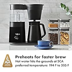 - Get rich flavorful coffee at the push of a button. The OXO 9-Cup Coffee Maker uses BetterBrew™ precision technology to optimize brewing time and ensure that water hits the grounds at 194–204.8°F -- the SCA-preferred range for a better-tasting brew. The double-wall thermal carafe keeps your coffee hot while the pause and pour feature lets you grab a grab a cup before brewing is complete. If you depend on fresh coffee, the freshness indicator will make your day, every day. The OXO Brew 9-Cup Coffee Maker is recognized as an exemplary home brewer by the SCA (Specialty Coffee Association) for delivering rich, gold-standard coffee – every time.