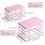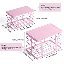 - Upgrade your home organization with our 2 Pack Trash Bag Holder with Bamboo Top—a stylish and functional solution for storing garbage bags and more. Designed in an elegant pink color, this set not only keeps your home tidy but also complements modern and cute decor styles. Each set includes two sizes: Small (9.84"x5.51"x5.71") fits 13-gallon rolls under 90 bags, while Large (10.63"x6.42"x7.09") fits 13/30/33-gallon rolls. Perfect for use as a trash bag dispenser or garbage bag organizer, making it ideal for kitchens, laundry rooms, bathrooms, or pantries. Built with a natural bamboo lid and a durable stainless steel basket, the dispenser is waterproof, rustproof, and long-lasting. The bamboo lid also provides extra space to place small items, while the hollow-out basket design allows quick visibility and access.