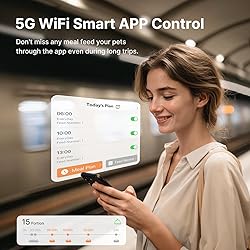 【Smart APP Control】DUDUPET Automatic cat food dispenser can connect to 5G/2.4G Wi-Fi. Compared to 2.4G Wi-Fi, this feeder with 5G feature would connect to network more stably. It allowing you to program your pet's meals anywhere anytime through the App on your iOS or Android smartphone. 【Easy Operation】The cat feeder automatic has the convenience of app control while retaining the flexibility of manual operation. You can feed your petinstantly through your mobile phone, or feed manually using the buttons on the machine (without interrupting scheduled feedings) or set up a feeding schedule directly on your phone for seamless eating. 【Spacious 5L Food Storage】DUDUPET cat feeder with large 5L (1.3 Gallons / 21 Cups) container holds enough dry food to last several days, saving you from daily refills. Whether you’re working late, enjoying a weekend getaway, or caring for multiple pets, your furry friends will always be fed on time. Recommended for dry kibble sizes between 0.07 to 0.55 inches. 【Dual Power Supply】DUDUPET automatic cat feeder designed with a 5V DC adapter plus 3 optional D-cell batteries (not included), this feeder works reliably even during unexpected power outages. Your pet’s feeding schedule stays on track at all times. Recommended to use both battery and adapter for uninterrupted operation. 【Fresh in Sealed Space】A lockable lid, sealed food container, built-in desiccant box, The included desiccant bag in the cat feeder automatic keeps the cat food fresh and crispy. The anti-jam dispensing system ensures smooth, accurate portions without clogs—every meal delivered just right. Easily keep your cat or dog fed during long weekends and short business trips; Get the peace of mind of a full and happy pet. 【𝐖arm 𝐓ips】𝐖hen 𝐈nstalling the product, please make sure to align the slots of the rotor with the base, then rotate the blade until it is securely locked in place and cannot move anymore to prevent it from popping out or shifting, which may cause dispense failure.