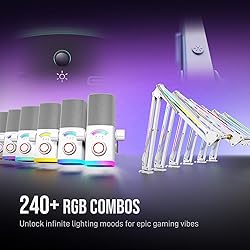 [Studio-Grade XLR Clarity] Experience broadcast-quality audio with 48kHz/24bit sampling rate and 115dB SPL that preserves every vocal detail—from tactical callouts to excited reactions. The sleek pc gaming microphone in white reflects your setup's premium vibe while delivering natural warmth streams. Your audience hears pure emotion, not background hum via the podcast XLR microphone. [USB Agility] The USB computer microphone give a key to switch between PC and PS5 in 3 seconds with plug-and-play versatility. The illuminated mute tap glows to indicate recording status—no more "accidentally live" moments during private conversations. The dynamic microphone perfect for multi-platform gamers who value both speed and discretion. [Function Command] Monitoring in real-time and independently adjust input and output levels with precision via the big 3-in-1 knob on the streaming mic. Balance the audio ratio of pc or monitoring without alt-tabbing when co-op partners get loud. Simply turn their channel down—no more drowning in chaotic audio. [RGB Ecosystem] The boom arm and computer microphone operate as independent RGB zones, both offering 15 lighting modes—from breathing patterns to rhythmic pulsating effects while maintaining steady ambient glow, enhancing your setup's aesthetics without distracting during gameplay. The boom microphone crafted with milky-white, the LEDs emit a soft, eye-comforting radiance that streams beautifully. [Extended Reach Pro Arm] The boom mic kit with total 30-inch reach and thickened construction, eliminating desk shakes while accommodating standing or seated positions. The included windscreen foam features a multi-layer structure that disperses plosive bursts and minimizes breath noise without muffling vocal clarity.