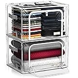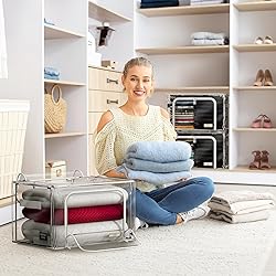 CLOSET STORAGE ORGANIZER SET - (2 Pack Clear) Store and protect clothing and household items with box style containers for organizing your bedroom. CLEAR DESIGN - Features clear Bins to view contents at a glance - Metal wire frame sustains shape and avoids flattening contents, and can stand one of the other with 2 strong zippered flap doors. EASY ACCESS & CLUTTER-free Organization and Storage - Front and top zipper opening makes it easy to store and remove contents - Secure carry handles allow for easy transport - Zips closed to protect contents from dust, pests, water damage, smells, moths, and more — Card holder allows for easy content labeling. STACKABLE & FOLDABLE, -SPACE SAVING - Sturdy frame stacks above and beneath additional organizers - Tucks away when not in use due to collapsible design - Store on shelves, in larger chests, closets, buffet hutches, garage, basement, attic, or under bed in home, office, dorm — Easy set-up: frame simply pops open into a large storage bins. MULTIPURPOSE - For seasonal clothing, bedding, blankets, comforters, linens, holiday decorations, books, toys, baby clothes, shoes, handbags, and more - Great for storing on shelving units, larger chests, closets, buffer hutches, basements, attics, garages, or under the bed - Made of 100% polyester - Measures approximately Please check on info image