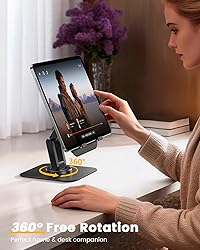 【360° Rotation】 Lamicall adjustable iPad stand for desk features a fully rotating 360° base, making it easy to share your screen with colleagues or clients without moving your device. This iPad holder stand is perfect for meetings, team collaborations, and presentations. 【Three-Axis Adjustable】 This iPad stand lets you adjust tilt and height independently with three-Axi hinges. Perfect for video calls, drawing, streaming, and multitasking. Use the included wrench to customize hinge tightness to your liking. Enjoy stable support and smooth folding. 【Foldable & Portable】 This iPad holder for desk folds completely flat, making it easy to carry in your backpack, laptop bag, or carry-on. Lightweight yet sturdy, it’s the perfect addition to your iPad accessories. 【Wide Compatibility】 The tablet stand fits 4.7" to 13" devices, like 2025 / 2024 / 2022 iPad Pro 12.9" / 11" / 10.5" / 9.7" , iPad Air 6 / 5, iPad Mini 6/ 5/ 4/ 3, iPad 5th/ 6th/ 7th/ 8th/ 9th/ 10th generation, iPhone 17 16 Pro Max Plus Air, Surface, Kindle Fire HD, E-readers, portable monitors, etc. 【Heavy-Duty Metal Base】 This tablet stand for desk features a solid metal base and sturdy connecting rod for stability, durability, and a no-tip design. The tablet stands are reliable office accessories for everyday use.