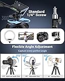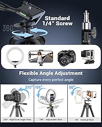 Complete Pro-Grade Vlogging Kit: This upgraded Yeaki vlogging kit is crafted for video creators, featuring essential filming tools—a sturdy camera tripod for stable shots, a portable desktop tripod for versatile framing, a dimmable ring light for soft even lighting, and wireless microphone for crystal-clear audio. Plus a secure phone clip, two hose brackets, and a Bluetooth remote for seamless control. All-in-one professional solution for YouTube/TikTok/Live Streaming/Video Recording. Versatile Tripod for Dynamic Shooting: This content creator kit includes a phone tripod stand that extends to 57", with adjustable aluminum legs and a secure locking mechanism for quick setup. Features a 360° rotatable head for horizontal/vertical switching and tilt adjustments. With a standard 1/4" screw interface, it accommodates ring lights, phone holders, and cameras, tripod with ring light ensuring flawless capture from every angle. Ideal for influencer light and creative content creation. Portable Desktop Tripod: The ring light for desk includes a compact and sturdy desktop tripod, extends to 22.4" for zoom meeting lighting and close-ups. Features 360° rotation for horizontal/vertical switching, perfect for desk ring light spaces and travel shots, transforming into a selfie stick. Includes a 1/4" screw interface to securely hold ring lights, phones, or cameras. Ideal for both desktop and ground use, enabling content creation possibilities. 10-Inch Dimmable Ring Light: This ring light with stand adopt high-quality LEDs (10W max output) offers 3 color temperatures (3000K-6500K: Cool White/Warm Yellow/Daylight) and 10 brightness levels. Ring light for phone provides soft, uniform light that enhances details, reduces shadows, and delivers professional natural lighting for live streaming, makeup, and photography. (Note: Ring light rated 10W – recommended 5V/2A adapter for optimal performance). Crystal-Clear Audio: Our wireless microphone offers 79ft transmission range, allowing free movement while shooting. Lightweight design clips to collars/shirts/pockets, capturing vocal details precisely—a content creator essential. Auto-pairing on power-on, plug-and-play, beginner-friendly, 12-hour battery (2-hour fast charge). Dual Type-C + Lightning ports for seamless device compatibility, supports 2 mics simultaneously. Ideal for interviews, vlogging, and live streaming. 360° Rotatable Phone Holder & Bluetooth Remote: This YouTube Starter Kit has 2 types of phone holders. Ring light tripod for iphone fits for 4.7-7" smartphones (iPhone/Android). The adjustable phone holder has 360° flexible gooseneck that bends freely, with multi-angle adjustment for portrait/landscape switching. Selfie stick tripod with remote charges via Type-C charging, pairs seamlessly with Bluetooth, and supports wireless shooting up to 33ft.