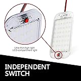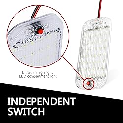 Comfortable Lighting: Features 48 evenly arranged LEDs on an alloy substrate, delivering 800 lumens of soft, uniform light via a diamond lens. Reduces eye fatigue during long nights, offering a wide illumination range for clear visibility in vehicles. Durable Build: RV Interior Lighting crafted with waterproof PC casing and an alloy heat-dissipation substrate that quickly disperses LED heat. Diamond lens design enhances light penetration, extending service life while maintaining stable, flicker-free lighting. Easy Installation: The LED dome light comes with double-sided tape and 8 screws for two secure fixing options. Simple wiring—red to positive, black to negative. Reserved screw holes fit most installation needs, taking just minutes to set up. Convenient Control: The LED dome light equipped with a flexible red independent switch button on one side. Manually press to turn on/off individually, perfect for targeted lighting like reading or illuminating specific vehicle areas without hassle. Widely Compatible: These LED dome lights works with DC12V-85V voltage (avoid overvoltage). Measures 5.9"x2.9"x0.35", fitting cars, SUVs, trucks, RVs, campers, boats, and ideal as trunk, cabinet, or indoor dome lights.