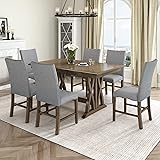 Merax Mid-Century 7-Piece Dining Table Set, Extendable Kitchen Table Set with Upholstered Chairs Set for 6, Golden Brown+Gray