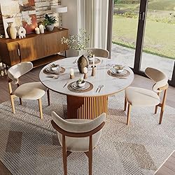 - POVISON chic round dining table is equipped with 12mm glossy sintered stone tabletop, also with distinctive smile-like curved solid wood base design ensures stability, durability, and adds a stylish, modern touch to your dining space
