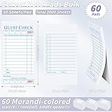 Server Note Paper Bulk: You will receive 60 packs server note pads, each containing 50 sheets, totaling 3,000 sheets. The quantity is sufficient to meet your daily usage and replacement needs. The guest check measures 6.75 inches x 3.5 inches, with a moderate size that can be easily placed in a standard apron pocket or waiter's manual. It is also comfortable and portable to hold with one hand, making it convenient for you to provide service and settle bills Efficient Office: This is a numbered guest check server notepad. Each waitress notepad has a unique serial number printed on the top, which is numbered in sequence to avoid handwriting errors. The top bar also has the date, table number, number of guests, and order details, which can be used to easily control the order. Contains reminders for appetizers, soup or salad, main course, vegetables or potatoes, dessert and drinks, which is convenient for reminding waiters about each step of the meal Morandi-Colored Guest Check Pads: Our server check pads are made of thicker paper, with a moderate thickness that prevents ink leakage and smudging. The soothing and soft Morandi colors are very pleasing to the eye. The order pads for servers have a logical layout, clear printing, and are easy to write on both sides, with ample space for recording longer orders. Each guest check book has a "Thank you" printed at the bottom, making customers feel valued Easy To Tear: The restaurant order pad features an easy-tear line at the top for quick and easy removal and handing to the kitchen. An easy-tear line is also present at the bottom for easy receipt copy given to the customer or for record-keeping. These easy-tear lines on the server pad help you organize orders, ensure efficient service, and optimize your business operations Wide Range Of Uses: These reliable guest checks for servers easily adapts to various settings—cafes, restaurants, food trucks, and bars, among others. Waiter can use this server check book to record customer orders, track tasks, and manage transactions clearly. It streamlines the service process for waiters while enhancing the customer experience and leaving a memorable impression, encouraging repeat business and customer loyalty
