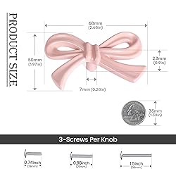 【Please note the dimensions】: There are two sizes of bow knobs available, 2.76×1.57inchs and 1.6×0.8inchs. Select the most suitable size for your product 【Complete Accessories】 3 size screws and 2 pcs washers is equipped: 0.74"(19mm),0.98"(25mm),1.5"(38mm).Suitable for furniture installation of different thicknesses 【The cute pulls】: Features a charming 3D bow shape . Perfect for upgrading girls' bedrooms, nurseries, dressers, and cabinets. It also beautifully complements furniture in bathrooms, closets, and throughout the home 【Superior Quality】: Crafted from solid zinc alloy, this bow pull offers exceptional corrosion resistance and durability, available in a variety of colors for your selection 【Easy Installation】: Enjoy a quick and simple upgrade with standard threading screws. The process is effortless: just drill a hole and secure the knob from the front. No special tools or skills required, making your DIY furniture refresh completely hassle-free