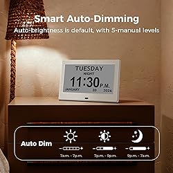 The Clock You Never Knew You Needed; Featuring a 7inch IPS display with 1024×600 res, this digital clock puts the time, date, and day in clear, large view from any angle. Stop fumbling for your phone to check the time! At a glance—whether in your office, kitchen, or bedroom—you instantly see the time. It’s the simple luxury you’ll soon rely on every day. With adjustable brightness, the alarm clock has easy for everyone, especially seniors, dementia and the visually impaired, to read comfortably. A Clock That Orients You to the Time of Day; Waking up disoriented? This digital clock with date and time divide the day into five clear phases: Before Dawn, Morning, Afternoon, Evening, and Night. It instantly answers "Is it morning or night?"—a simple but critical feature for people with dementia, Alzheimer's, memory loss, or shift workers waking in the dark. Supportting both 12/24-hour format, this large display clock offers a truly supportive and practical time-telling experience. Alarms & Daily Reminders; This large digital clock for seniors features 6 custom alarms and 10 daily reminders, all with 5 adjustable volume and 5 tones. Reminders with visual icons of this digital calendar clock help track medication, hydration, sleep, and more, making it an essential tool for the whole family – offering vital support for seniors with dementia, fostering time management skills in kids and students, and providing simple help for busy parents. Auto Brightness & Custom Themes: This dementia clock offers comfort viewing with intelligent auto-dimming that adjusts to your room's lighting, plus 5 manual fixed brightness levels. Enjoy hassle-free timekeeping with automatic Daylight Saving Time updates. Then, make the digital alarm clock truly yours: personalize the display with 8 languages (English, Cymraeg, Polski, Español, Nederlands, Italiano, Deutsch, Français), 5 display styles, and 4 color themes to create your ideal look. On-Device Buttons & Remote Control; Manage your electric clock with ease. Make quick changes directly using the onboard buttons, or relax in comfort and use the included remote for seamless control from couch. Its flexible design makes it perfectly a desk clock or mounted wall clock. Please note: The alarm clock must be plugged in at all times using the original power adapter.