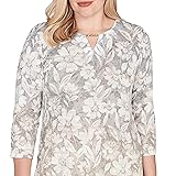 - Ombre floral blooms across this soft latte knit, accented with subtle metallic touches for a hint of shimmer. Designed with a keyhole neckline, three-quarter sleeves, and a relaxed straight hem, it's a graceful piece that brings depth and romance to your seasonal wardrobe.