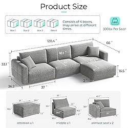 CLOUD-LIKE COMFORT: The oversized couch is built with precision-layered cushioning, combining plush cotton with high-resilience foam over a sturdy box-spring base. This creates a foundation of deep, consistent support. Unlike simpler boneless sofas that rely solely on filler and can sag over time, our design maintains its shape and structure, resisting deformation even with daily use. It delivers enduring, uniform comfort—a durable and reliable choice for your home, year after year MODULAR FLEXIBILITY: Configure your perfect seating with this modular sectional sofa. Measuring 128"W x 66"D x 33"H, it comfortably seats 3-4. The movable ottoman allows you to create an L-shape, U-shape, or separate chaise and loveseat to fit your living room, apartment, or home theater. Built with a solid wood and steel frame, each seat supports up to 300 lbs for reliable, everyday use ERGONOMIC SUPPORT: The cozy cloud sofa features a smart zoned seat – firm support in the center and soft, sloping edges. The spacious 37" wide seat and 22" deep cushion provides ample room to lounge or curl up. Plush backrest cushion offers full lumbar support to ease pressure points. The 8.7" wide armrests are perfect for resting your arms or keeping remotes within reach. The gently lowered front edge makes sitting down and getting up effortless, creating an immersive and comfortable experience PREMIUM FABRIC: Upholstered in soft, breathable chenille fabric that feels gentle against the skin, this luxury sofa is comfortable year-round. The removable, machine-washable covers make maintenance easy. Available in three vintage-inspired colors, it adds a touch of understated elegance to complement a variety of home décors EASY SETUP & SUPPORT: Your cloud couch sectional arrives in multiple boxes for easier handling. Please check all packages upon delivery. The cushions are vacuum-sealed; after unboxing, simply fluff and gently massage them—they will regain their full loft within 48 hours. If you notice any shipping damage or are not satisfied with your purchase, please contact our customer service team. Your feedback is important to us