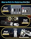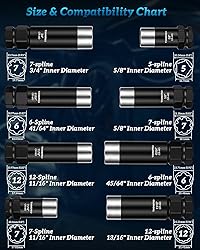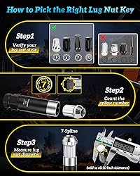 Spline Lug Nut Socket;5 Spline (5/8''), 6 Spline (41/64'',45/64''), 7 Spline (3/4'', 5/8'', 11/16''), 12 Spline ( 13/16'', 11/16'')Designed for aftermarket lug nuts on popular makes & models. Purchase Instructions:Our lug nut socket set ONLY fits 5/6/7/12 spline wheel nuts, please check the Lug Nuts Style, Spline Number and the Spline Diameter before purchase to make sure it works. Dual Hex Drive: Each wheel lock key features a double hex head drive design with clearly identifiable size markings,that fits most lug-nut wrenches and 13/16 inch and 7/8 inch sockets. Reliable and Safe:Our lug nut key made of heat-treated CR-MO42 steel with an alloy anti-cracking laver for extra strength and durability.Thin walled structure prevents scratches when removing. The Ultimate Gift: Ideal for mechanics and DIY enthusiasts. When the original lug nut socket is missing, you will have a universal wheel lock removal kit that fits a wide range of models.