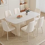 Spacious Oval Surface for 6: This 67'' x 35.4'' white dining table set comfortably accommodates 4-8 people, creating a spacious space for everyday meals and festive gatherings. The elegant white marble pattern enhances both small and large dining areas with modern charm 3.5'' Thick Marble Top for Strength: Designed with a 3.5-inch thick marble-patterned top, this cream white dining table set resists warping or shaking over time. Smooth rounded corners enhance safety, making this dining table and chairs set of 6 suitable for households with children or pets Stable and Durable Construction: Made from high-quality engineered wood and supported by a sturdy black Roman-style column base, this modern dining table set for 6 offers strong support. The table safely holds up to 300 lbs, and each chair supports up to 250 lbs for reliable use every day Easy Cleaning and Quick Assembly: The smooth tabletop resists stains and scratches, while the faux leather chairs can be easily wiped clean after meals. All necessary hardware and instructions are included, allowing you to assemble this 7-piece dining table set in about 30 minutes Modern Cream White Design: Featuring a sleek white marble finish paired with a solid column base and 6 metal-legged chairs, this white marble dining table set combines elegance with practicality—ideal for modern kitchens, dining rooms, or meeting spaces