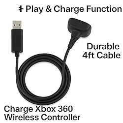 - Keep your gaming sessions uninterrupted with this Controller Charging Cable for Xbox 360. Designed for reliable power and data transfer, this USB Play and Charge cord connects directly from your console or PC to your Xbox 360 wireless controller for fast, stable charging while you play. The durable, flexible cable features a tangle-resistant jacket and secure connector ends to ensure a solid fit and long-term performance. It supports simultaneous charging and gameplay, so your controller stays powered without downtime. Compatible with all standard Xbox 360 wireless controllers, this cable is ideal as a replacement or spare for everyday use. Its black finish complements any setup and keeps your accessories organized and ready for action. Features: Charges Xbox 360 wireless controllers during gameplay Supports power and data transfer via USB connection Durable, flexible design resists tangling and wear Compatible with console or PC USB ports Ideal replacement or backup charging cord (black finish)