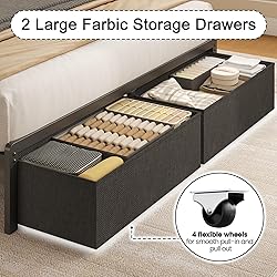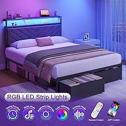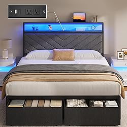 【Large Storage Space for the Whole Family】 Fluest Full bed frame with storage make a smart sleep solution for anyone who enjoys maximizing the storage potential of your bed room. 2 storage drawers under bed keep your out-of-season clothes and bedding clean and organized. The wheels beneath the drawer ensure it can be pulled out effortlessly. 【Customizable Lights for Ambiance and Mood】You can match the lighting to your mood. Remote control allowing you to change colors and lighting modes without getting out of bed. Over 6,000 colors for you to choose from. A full bed frame with LED lights instantly make your bedroom look modern and thoughtfully designed 【Headboard with Charging Station】The headboard features a built-in charging station at its top, comprising two AC outlets, one USB port, and one Type-C port. This versatile array of charging interfaces caters to your daily charging needs, allowing you to recharge your devices without leaving the comfort of your bed. 【Upholstered Headboard for Comfort】A cushioned fabric bed frame is more comfortable to lean against than traditional wooden headboard. Our upholstered headboard provides increased softness and optimal support when you reading or watching TV in bed. Modern twill design headboard instantly elevates your bedroom's style. 【Sturdy and Stable Structure】Our bed frame full size features a robust metal bed construction and a foam strip, reinforced with strong legs and a center support system. This thoughtful design ensures the entire bed frame remains shake-free and durable for years of reliable use. Assembly by an adult takes about 1 hour.