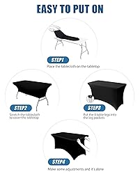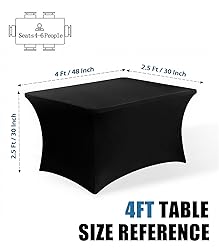 • Upgrade your events with our premium stretch fabric tablecloth, crafted from 90% polyester and 10% spandex. This fitted rectangle table cover is durable, elastic, wrinkle-resistant, and washable, delivering a clean and elegant look for any setup. Designed to fit 4 foot rectangle tables (48"L x 30"W x 30"H), including folding tables, picnic tables, and dining tables, the reinforced leg pockets keep the table cloth snugly in place, even outdoors or in windy conditions.  Perfect as a white table cloth rectangle table, black table cloth, or red tablecloth, it suits a variety of styles and occasions. From birthday parties, weddings, banquets, camping trips, and picnics to business events, school functions, festival decoration, and beach outings, this fitted tablecloth adapts to both indoor and outdoor table settings. Use it as a picnic table cover with bench covers, a back to school tablecloth.  Our reusable and washable spandex table covers for 4ft tables are easy to set up—just insert table legs into the pockets for a tailored fit. After use, simply machine or hand wash in cold water and tumble dry low. These table cloths for 4 foot rectangle tables are durable enough for long-term use, whether for the kitchen, dining room, banquet hall, pool table cover, fall gatherings, or outdoors.Make every event look neat, stylish, and professional with these spandex fitted tablecloths.