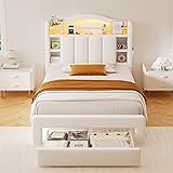 MULTI-FUNCTIONAL STORAGE HEADBOARD: This twin bed frame combines comfort and practicality, innovatively integrating an open shelving display with a plush upholstered headboard. The shelves are perfect for displaying photo frames and books, while the top platform offers convenient space for phones, glasses, and other essentials. A hidden flip-top compartment behind the padded headboard maximizes space, offering discreet storage for private items and helping keep your bedroom tidy. MODERN UPHOLSTERED PLATFORM BED: Crafted in a beige hue with vertical channel-tufted detailing, this bed frame exudes minimalist elegance and depth. The high-density velvet upholstery offers a soft and skin-friendly touch, radiating an elegant and lightly luxurious aesthetic. Its design seamlessly blends into various modern home styles, adding a warm, soft, and sophisticated tone to any bedroom. INTEGRATED CHARGING STATION & SMART RGB LIGHTING: This bed frame features 2 AC power outlets, 2 USB-A ports, and 1 USB-C port, so you can charge all your devices—phones, tablets, laptops, and lamps—in one tidy place. No more extra power strips! Plus, built-in adjustable RGB LED lights offer 16 million colors, 20+ lighting effects, and dynamic modes. Control via app or remote to create a soothing or romantic mood and elevate your bedroom's ambiance. 2 LARGE CAPACITY DRAWERS: [MAXIMIZES SPACE UTILIZATION] Equipped with 2 spacious and smooth-gliding silent drawers at the foot of the bed, this design offers ample storage for off-season clothing, spare bedding, or other household items, helping you maintain a clutter-free bedroom. The drawer‘s bottom lining prevents dust. Ideal for small spaces or households that prioritize efficient organization, it effectively doubles your storage options and keeps your room neat and spacious. FULLY UPHOLSTERED DESIGN: [STURDY AND NOISE-FREE SUPPORT] The headboard is padded with thick, high-resilience foam for superior comfort and support while sitting up. The fully upholstered bed frame also includes padded edges to prevent bumps and injuries, making it especially safe for families with children or elderly members. Supported by a reinforced solid wood frame and thick, quiet legs, the bed ensures exceptional stability—guaranteeing you a peaceful and restful sleep every night.