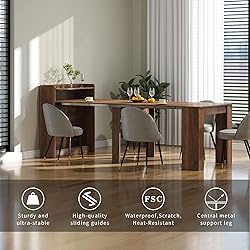 - 【Extendable Dining Table】Features 4 removable extension leaves (35.4" x 19.6" each), allowing the table to expand from a compact 20" to a generous 99", comfortably seating 1 to 9 people. Perfect for intimate dinners or large gatherings.【Space Saving Dining Table】Built with an aluminum telescopic mechanism and a central iron leg for superior stability. Each leaf is easy to insert and remove, adapting seamlessly to your dining needs. Measuring just 20” wide when folded, it doubles as a space-saving console or entryway table.【High-quality Materials】The thick MDF surface is moisture-proof, anti-corrosive, heat-resistant, and wear-resistant, ensuring lasting durability and a modern aesthetic. The table supports up to 550 lbs for worry-free use.【Applicable to Multiple Scenarios】Whether used as a compact console table or fully extended as a banquet table, its sleek and modern design complements any room. Ideal for kitchens, dining rooms, or as a multifunctional conference table.【All Accessories are Complete】There are installation instructions and complete accessories in the package, which can quickly help you assemble the dining table.