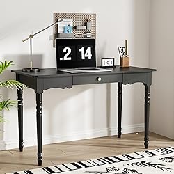 Ample Workspace - This home office desk feature a 47.2” desktop, suitable for working and studying. It features ample space to hold office supplies, like laptop, pen container and lamp. It possesses a small drawer, fitting to store some accessories. Dimension: 23.6”D x 47.2”W x 29.4”H Versatile Desk - The wood desk boasts a classic appearance that complements a wide range of home decor styles. It will effortlessly adapt to your daily tasks: as a computer desk, a study table, a craft station, or a makeup vanity. And rectangular shape can seamlessly fit into your office, living area, or bedroom Timeless Elegant - This office desk is painted in black, with gold knob, presenting vintage aesthetic. Legs adopt decorative design, offering a unique and refined look. Smooth lines and round edges can not only bring a touch of modern elegance, but also prevent bump injures Built to Last - The writing table is mainly crafted from medium density fiberboard, sturdy for long-term use. Legs are made of solid rubber wood, offering reliable support to desktop. With stable structure, it features good load capacity for daily use Easy Installation - This mid-century modern desk is easy to assemble. It comes with a detailed manual and necessary accessories. All hardware is labeled. Please check all parts are received and intact before assembly process and follow the directions carefully