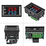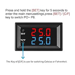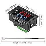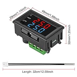 Dual-Color LED Display clearly shows both current temperature in red and your set temperature in blue for easy monitoring in heating or cooling mode Wide Measurement Range from -50°C to 110°C (-58F to 230F) with a simple button to switch between Celsius and Fahrenheit readings Waterproof NTC Probe ensures accurate and reliable temperature sensing in humid environments, allowing for precise control Versatile Applications ideal for aquariums, incubators, equipment cabinets, HVAC systems, and various DIY temperature control projects Low Power Operation at just DC 12V 200mA for energy-efficient performance and easy integration into different systems