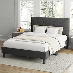 ADJUSTABLE HEADBOARD: This upholstered bed frame features an adjustable headboard that ranges from 35.9"–39.6", fitting mattresses 8"–12" thick. Choose your ideal height for comfort and support whether you prefer a sleek modern look or a cozy layered setup. STYLISH AND COMFORTABLE: Wrapped in premium linen fabric with dense foam padding, this bed frame blends modern simplicity with soft comfort. The sleek silhouette and neutral tones — Dark Grey — complement any décor, adding an elegant and inviting touch to your bedroom. NOISE-FREE DESIGN: Designed with noise-reducing pads and anti-slip floor protectors, this frame ensures quiet stability while protecting your floors. The Velcro-attached wooden slats keep everything securely in place, minimizing movement and preventing squeaks for a peaceful sleep. EASY ASSEMBLY: All parts, tools, and instructions are clearly labeled for simple installation. With the help of two people, you can assemble the bed in about 20 minutes. No additional tools or box spring required. DURABLE SUPPORT: This bed frame is built with a sturdy wooden frame, 10 solid wood slats, and 14 reinforced legs, providing reliable stability. It can support up to 1000 lbs, ensuring long-lasting durability and a secure sleep experience. Made from FSC-certified wood, it combines strength with sustainable materials.