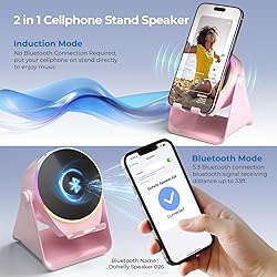 【Wireless Induction Speaker】- No Bluetooth Pairing Needed, experience instant, high-fidelity sound with cutting-edge wireless induction technology. Simply place your smartphone on the stand, and the built-in speaker amplifies your audio without any Bluetooth connection or app installation. Perfect for streaming music, podcasts, or calls at home, in the office, or outdoors 【Multifunctional Cool Gadget】- This 4 in 1 device functions as a wireless induction speaker, Bluetooth speaker, adjustable phone stand, and RGB ambient night light—delivering convenience, functionality, and style in one sleek design. Whether you’re working, watching videos, or chilling out, this gadget fit into your daily life and enhances your tech experience 【Adjustable & Stable Phone Stand】- The smartphone holder features a anti-slip triangle base to protect your phone from slide and scratches. The phone cradle angle can be 300 °adjustable to provide you a comfortable viewing angle when you’re enjoying movies, reading, studying and playing games, etc 【Color Changing Ambient Light】- This cellphone stand speaker adopted dynamic color changing led lights around the round speaker, which add romantic atmosphere when you turn it on. This feature creates a calming and modern vibe for bedrooms, dorms or camping tent 【Universal Compatibility】- Designed for wide compatibility, this phone speaker stand supports all major 4-13 inch electronic devices, such as iPhone, Samsung Galaxy, Android phones, iPads, tablets, e-reader and more. NOTE: Please take off the protective cover when you’re using induction mode