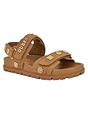 - Elevate your everyday look with the GUESS Florizi embellished sandals. Featuring faux-suede straps with gold-tone medallions, adjustable hook-and-loop closures, and a cushioned footbed on a chunky lug sole, they deliver all-day comfort with signature style.