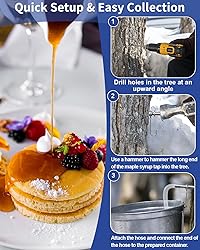 - Harvest pure, high-quality maple syrup right from the tree with our maple syrup tapping kit. Whether you're a beginner or a seasoned syrup maker, this kit is designed to provide everything you need to start tapping maple trees and collecting sap. Made with durable, food-safe materials, it's perfect for home syrup production, offering an authentic and rewarding maple syrup-making experience.Perfect for DIY Maple Syrup Production and Ideal Gift for Syrup Lovers: Whether you're tapping a single tree in your backyard or planning to scale up your syrup-making operation, this maple tree tapping kit has you covered. It's also an excellent gift for maple syrup enthusiasts or anyone interested in self-sufficient maple syrup production.Designed for both beginners and experienced syrup makers, this maple tapping kit is incredibly easy to use. Simply drill a hole in the tree, insert the maple taps, and attach the maple syrup tubes to start collecting sap.Perfect Gift for Maple Syrup LoversWhether for a beginner maple syrup maker or an experienced syrup enthusiast, this tree sap tapping kit makes an ideal gift. It's perfect for anyone passionate about sustainable living, DIY projects, or homegrown food. Help your friends and family tap into the sweet rewards of maple syrup production!"Start harvesting your own fresh, high-quality maple syrup with our maple syrup tapping kit. This all-inclusive kit provides everything you need to tap your trees, collect sap, and create delicious homemade syrup. Ideal for beginners and experienced syrup makers alike, this kit is designed to make the syrup-making the process simple, efficient, and enjoyable.User Friendly Design for Effortless Sap CollectionEach component of this maple tree tapping kit has been thoughtfully designed for ease of use:- The tapered end of the maple syrup taps allows for easy insertion into the tree without causing harm.- The stainless steel hook makes it simple to hang your maple syrup bucket for sap collection.- The maple syrup tube maintains a tight seal to reduce sap exposure to sunlight and ensure a continuous, smooth flow into your collection bucket.- A cleaning brush ensures easy cleanup after each syrup season, so your taps are ready for the next year.- Clear instructions make the syrup-making process easy, enjoyable, and rewarding.
