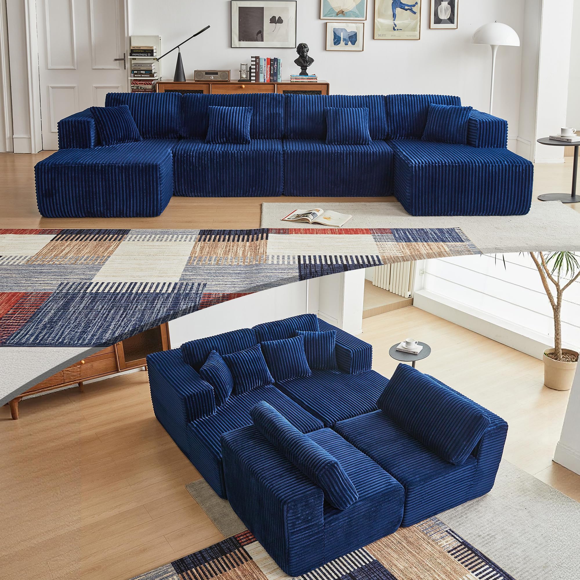 Spacious Double Chaise Lounge Design: Elevate your space with our modular U-shaped sofa—crafted in luxurious striped fabric, featuring clean lines and timeless elegance. Versatile, comfortable, and effortlessly stylish, it becomes the centerpiece of any room Luxury Aesthetic and Premium Material: Elevate your living room with this U-shaped sectional sofa, crafted with high-quality corduroy fabric and clean, modern lines. Designed to exude sophistication, this luxury modular sofa seamlessly enhances the ambiance of living rooms, apartments, or bedrooms. Versatile Modular Configuration: Adapt the arrangement to suit your space with this sectional couch. The chaise can be used independently or combined with the main sofa, offering flexible options for different room layouts while retaining its sleek, timeless design. Unmatched Comfort for All-Day Relaxation: This sectional sofa boasts soft, breathable corduroy upholstery, high-density sponge cushions, and a spring pack for optimal support. With plush pillows and ergonomically designed armrests, it guarantees a supremely comfortable seating experience. Convenience Meets Practicality: Say goodbye to assembly hassles with this modular sofa. Simply unbox, arrange, and let the materials regain their plush form within 72 hours, delivering an effortless and luxurious centerpiece for your home.