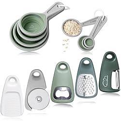 - Comprehensive Set This set comes with measuring cups and spoons of various sizes, ensuring you have all the essentials for baking, cooking, and meal prep. The inclusion of a cheese grater, pizza cutter, peeler, bottle opener, and garlic grinder makes it a versatile package, allowing you to tackle various kitchen tasks without needing multiple separate tools. Space-Saving Design One of the best features of this set is its space-saving design. The measuring cups and spoons nest neatly together, which is a major advantage for small kitchens or RVs where storage space is at a premium. The silicone material is flexible, making it easy to store and handle, and it’s also less likely to scratch or damage other kitchen items. Durable and Easy to Clean Made from high-quality silicone, the measuring cups and spoons are both durable and flexible. They can withstand high temperatures, which is a plus when measuring hot liquids. Cleaning is a breeze as they are dishwasher safe, and I found that they don’t retain odors or stains from food, which is a common issue with some plastic utensils. Accurate Measurements The measuring cups and spoons are marked clearly, allowing for accurate measurements every time. This is especially important for baking, where precision is key. The cups have a nice grip and are easy to pour from, making it simpler to transfer ingredients without spills. Additional Kitchen Gadgets The included kitchen gadgets are well-made and practical. The cheese grater works efficiently, and the pizza cutter is sharp and glides through crust effortlessly. The garlic grinder is a handy tool that simplifies food prep, while the bottle opener is robust and easy to use. Each gadget has proven to be a valuable addition to my kitchen arsenal. Overall Performance Overall, this measuring cups and spoons set has exceeded my expectations. It offers great value for the variety and quality of tools included. I’ve found myself reaching for this set regularly, and it has made cooking and baking much more enjoyable.