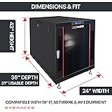 [SPACE-SAVING FLOOR STANDING DESIGN]: Perfect for office/home servers, network racks, and small IT setups, this 22U wall-mount server rack is ideal for keeping equipment secure and organized while saving room space. It's compact 35" depth is perfect for network cabinets and telecommunications equipment. IMPORTANT NOTE: The cabinet has 39" outside depth which provides a perfect fit for IT equipment up to 39-inch total depth leaving enough space for cabling, wires and airflow circulation. [OPTIMAL VENTILATION]: Features a Thermo Control System, with 2 powerfull cooling fans, glass front door with perforated sections sides to ensure proper airflow and prevent overheating, making it an ideal choice for media server racks and server cabinets in smaller spaces. [SECURE & EASY ACCESS]: The enclosure includes removable front and rear panels with lockable mechanisms, providing enhanced security and easy access to your equipment for maintenance. Ideal for small server racks and router cabinets. [ADVANCED CABLE MANAGEMENT]: Equipped with brush cable entries for clean and secure cable routing, minimizing cable clutter. This makes it a great choice for AV racks and server racks that require efficient cable management. [DURABLE AND RELIABLE]: Designed with high-quality steel, the cabinet can hold up to 1600 lbs of equipment. It's rugged design is perfect for wall-mounted network racks and telecom cabinets. [CONVENIENT INSTALLATION]: Includes a complete set of hardware, making assembly straightforward. The included PDU, shelf, and legs allow for easy setup and customization of your server or AV cabinet.