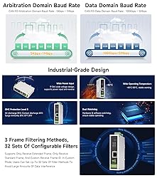 High-Speed Bidirectional Conversion: The CAN FD to ETH converter supports high-speed, low-latency data transmission between CAN and Ethernet network devices, ensuring stable and reliable performance. Multiple Data Conversion Modes: Offers five flexible data conversion modes, including transparent conversion, transparent conversion with ID, standard protocol conversion, Modbus protocol conversion, and custom protocol conversion, enabling seamless device interconnection. Industrial-Grade Durability: Designed for industrial environments, it operates reliably within a temperature range of -40°C to 85°C and supports a wide power input range of 9V to 36V. Flexible CAN FD Baud Rate Support: Supports a wide range of CAN FD baud rates, including 5Kbps~1Mbps for the arbitration domain and 100Kbps~5Mbps for the data domain, allowing for versatile integration with different systems. Easy Configuration and Installation: Offers simple parameter configuration via a host computer, with built-in 120Ω terminal resistors (switchable via DIP switches) and convenient DIN-rail mounting for easy installation in industrial settings.