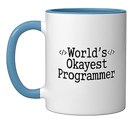 Simple funny "World's Okayest Programmer" text design celebrating Programmers with humor and confidence. Perfect for Programmers who appreciate humor and sarcasm. 11-ounce ceramic mug is dishwasher and microwave-safe, lead and BPA free Features glossy finish with accent colors on interior, handle, and rim of two-tone designs