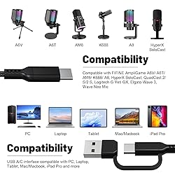 - Compatible Models: Compatible with FIFINE AmpliGame A6V, A6T, AM8, K688, A8, A6P, A6W, AM6, AM8T, TANK3, K651, K658 Microphone Compatible with HyperX SoloCast, QuadCast 2, QuadCast S, QuadCast 2 S, DuoCast Microphone Compatible with Logitech G Yeti GX, Yeti Orb Microphone Compatible with TONOR TC30 Microphone Compatible with Elgato Wave 3, Wave Neo, Wave 1 Microphone Compatible with Razer Seiren V3 Chroma/V3 Mini/V2 Pro/V2 X Microphone Compatible with Audio-Technica AT2020USB-X, ATR2100x-USB, ATR2500x-USB Microphone Compatible with Rode NT-USB Mini Microphone Package Includes: 1x Replacement USB C/A to USB-C Microphone Cable, 10ft/ 3m