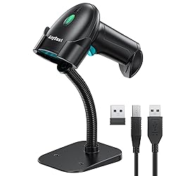 - 【Adjustable Stand】The wireless barcode scanner is equipped with an adjustable stand, so we can freely adjust the best scanning angle as needed. What's more, with an auto-sensing scanning sensor, we can easily realize handsfree scanning, with no need to hold the wireless barcode scanner and release our hands.【Stronger Decoding Ability】With advanced CMOS sensor, the barcode scanner can easily decode most of the 1D 2D QR barcodes on labels, paper and screen more accurate. Even damaged, blurring, incomplete, fuzzy, and reflective barcodes can be decoded easily. 1D like: UPC/EAN, Code39, Interleaved 2 of 5, Code93, Code 128, Codabar etc. 2D like: QR, Datamatrix, PDF417, Aztec, etc.【3 Types of Scanning Modes】This Bluetooth barcode scanner is equipped with key trigger scanning, auto-sensing scanning, and continuous scanning mode, we can choose different scanning ways according to work needs. The barcode scanner with 2000mAh ultra-large battery and storage upload mode helps to be widely used in supermarkets, stores, bookstores, shopping malls, retail, logistics, warehouses and others for file management, inventory tracking and point of sale.【More Customer Function】This USB barcode scanner supports custom settings, like add/hide prefix or suffix, add time stamp, add keyboard keys (TAB, CR, etc.) to the scanning operation, change the capital/lower case, etc. Also, it can freely enable or disable barcode type, easily suit our specific need. The user manual includes basic function settings such as enabling and disabling various barcode types, scanning modes, Bluetooth connection settings, and character settings. For more advanced settings, please contact us for assistance. Bracket clip: When using it for the first time, it may feel a bit narrow or tight, and you might need both hands to help place the scanner to prevent it from slipping. This is normal. After using the scanner multiple times, the clip will loosen, making it easier to place the scanner with one hand. The package includes: 1 x barcode scanner, 1 x 2.4G receiver, 1 x stand base, 1 x USB cable, and a user manual.
