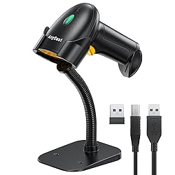 • 【Adjustable Stand】The wireless barcode scanner is equipped with an adjustable stand, so we can freely adjust the best scanning angle as needed. What's more, with an auto-sensing scanning sensor, we can easily realize handsfree scanning, with no need to hold the wireless barcode scanner and release our hands.【Stronger Decoding Ability】With advanced CMOS sensor, the barcode scanner can easily decode most of the 1D 2D QR barcodes on labels, paper and screen more accurate. Even damaged, blurring, incomplete, fuzzy, and reflective barcodes can be decoded easily. 1D like: UPC/EAN, Code39, Interleaved 2 of 5, Code93, Code 128, Codabar etc. 2D like: QR, Datamatrix, PDF417, Aztec, etc.【3 Types of Scanning Modes】This Bluetooth barcode scanner is equipped with key trigger scanning, auto-sensing scanning, and continuous scanning mode, we can choose different scanning ways according to work needs. The barcode scanner with 2000mAh ultra-large battery and storage upload mode helps to be widely used in supermarkets, stores, bookstores, shopping malls, retail, logistics, warehouses and others for file management, inventory tracking and point of sale.【More Customer Function】This USB barcode scanner supports custom settings, like add/hide prefix or suffix, add time stamp, add keyboard keys (TAB, CR, etc.) to the scanning operation, change the capital/lower case, etc. Also, it can freely enable or disable barcode type, easily suit our specific need. The user manual includes basic function settings such as enabling and disabling various barcode types, scanning modes, Bluetooth connection settings, and character settings. For more advanced settings, please contact us for assistance. Bracket clip: When using it for the first time, it may feel a bit narrow or tight, and you might need both hands to help place the scanner to prevent it from slipping. This is normal. After using the scanner multiple times, the clip will loosen, making it easier to place the scanner with one hand. The package includes: 1 x barcode scanner, 1 x 2.4G receiver, 1 x stand base, 1 x USB cable, and a user manual.