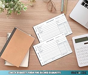 - Maintain organized financial documentation with the MICRO TEC Check Request Form, designed for efficient payment tracking and approval processing in professional business environments. Ideal for automotive dealerships, small businesses, accounting offices, and administrative departments, this form helps streamline internal financial workflows. Each form measures 8.5" x 5.5", offering a compact half-letter size that fits easily into filing systems, accounting folders, and desk organizers. The structured layout provides designated areas for payee information, payment description, approval authorization, and accounting reference details, supporting accurate record keeping and financial transparency.Printed on durable 20# white paper, these single-part forms provide a clean writing surface for clear documentation. The 100-forms-per-pad format ensures consistent availability for daily office use in dealership finance departments, accounts payable teams, bookkeeping offices, and general business administration.Key Features:8.5" x 5.5" half-letter check request form1-part single sheet format20 lb white paper construction100 forms per padDesigned for accounting and approval documentationSuitable for car dealerships, small business, and office finance useStructured fields for payment tracking and authorizationSupports organized record keeping and bookkeeping systems