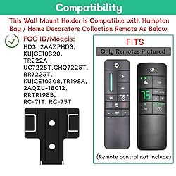 Wall Holder Mount for Hampton Bay Ceiling Fan Remote --- This is not a universal fit ! Only suitable these remotes model - 2AAZPHD3/HD3, 2AAZPHD1/HD1, KUJCE10320/TR222A, A25-TX031, 68108,98108, CHQ7225T/UC7225T, RR7225T, AmarRR, RC-71T, RC-75T, along with other compatible handheld transmitters. Keep Your Remote Control in Place --- This remote holder wall mount can help you avoid losing the remote control at home. You can put the remote control out of the reach of children. It is easy to store and organize, making the home tidier and saving more space for you. High-Quality Construction --- Built from durable materials for long-lasting performance and a secure, reliable hold for your ceiling fan remote. Wall Mount Holder for Ceiling Fan Remote --- Use it as a wall-mounted cradle around the house - whichever works best for your space and convenience. Package Contents --- 1 * ceiling fan remote holder, 2 * screws, 2 * plastic expansion, 1 * 3D command tape (REMOTE NOT INCLUDE).