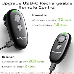 Rechargeable remote control compatible with Nikon Z8, Z9, D6, D5, D4, D3x, D3s, D3, D2Xs, D2X, D2Hs, Df, D850, D810,D810A, D800, D800e, D700, D500, D300s, D300 & D200 Wireless shutter release compatible with Nikon Z5, Z7 II, Z7, Z6 III, Z6 II, Z6, D780, D7500, D750,D7200, D7100, D7000, D610, D600, D5600, D5500, D5300, D5200, D5100, D5000, D3300, D3200, D3100, D90, P950, P1100 3.Updated USB-C rechargeability:Hanpusen wireless shutter release for Nikon features built-in rechargeable batteries: the transmitter delivers 72 hours of continuous use (1.5-hour full charge) via USB-C, while the receiver offers 200 hours of standby/shooting time (2-hour full charge). Compact, reliable, ensures you never miss a shot—whether you’re capturing long exposures, group photos, or wildlife from a distance. 4.Multifunction Wireless Remote :this camera shutter release for nikon support wired and wireless function, Auto-focus, single shooting, 2-sec delayed release, continuous shooting, and long exposure; 2.4GHz digital radio technology provides strong anti-interference and stable working distance up to 196 ft/60 m. 5.Compact and Easy to Carry:Weighing just 18g for the transmitter and 34g for the receiver, it fits easily in your camera bag or pocket without adding bulk.Minimal Weight, Maximum Freedom.