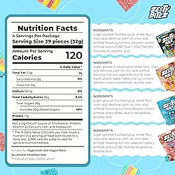 BITE-SIZED SOUR STRIPS BELTS: Mini sour strips bites made from thin sour candy belts are easy to chew and easy to enjoy. You get a bold sour burst in every bite—without dealing with long, sticky ropes or messy candy strips. THIN SOUR BELTS WITH NO STICKY MESS: These ultra-thin sour candy strips break cleanly into perfectly portioned bites that don’t pull, tangle, or cling to your teeth. Just a quick sour punch and a smooth chew from start to finish. VARIETY PACK WITH FOUR BOLD FLAVORS: Includes Blue Raspberry, Rainbow, Strawberry, and Banana, giving you a mix of classic and fruity sour flavors in one pack. Every bite delivers the same consistent taste and texture. RESEALABLE BULK VALUE PACK: Four resealable bags with 150+ bite-sized sour strips per pouch make it easy to snack a little or share a lot—while keeping everything fresh between grabs. VEGAN, SHAREABLE, EASY TO PORTION: Plant-based sour belts candy made for portion control, gifting, parties, and everyday snacking. No cutting, tearing, or cleanup—just open the bag and enjoy.