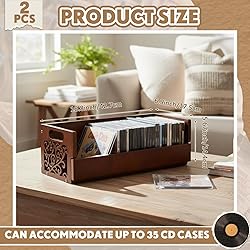 Package Include: you will receive two wooden CD storage boxes; The CD storage racks are crafted from natural wood with hollowed-out designs on both sides, allowing them to blend seamlessly with your decor and provide a more elegant storage solution for your precious CD collection Magnetic Flap: the closure of the front flap is fixed with a magnet, the CD movie storage provides easy access to all your music CDs, movie discs, cassettes, and VHS tapes; The firm magnetic fixtures ensure is secured, safeguarding your valuable CD collections from falling out or being misplaced Stackable Design: the CD storage rack's stackable design allows you to easily stack multiple; Its thick wooden bottom stability, ensuring the stacked racks do not easily topple over; Stack them up and create a stylish music corner that flaunts your beautiful collection Robust and Handy: the CD display case comes with a reinforced handle, making it convenient to move around; Easily pick up, carry, and rearrange the CD organizers to your desired position, thanks to the robust handle; Now, enjoy your music where you want, when you want Space Saving Solution: the dimensions of about 17.1 x 6.9 x 5.67 inches make the CD shelf capable of holding 36 standard-size CDs; Place your CD storage rack in a cabinet or on the desktop to keep your space clean; Save space and organize your music collection without compromising on aesthetics
