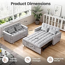 3 Angles Adjustable Backrest: With backrest angles of 105°, 135°, and 180°, this sofa sleeper allows you to comfortably read a book, lounge for movie nights, or recline flat for restful naps. Our loveseat sleeper sofa for living room are designed to adapt to fit your unique lifestyle.(enjoy exceptional neck and head support with two included soft pillows) 3 in 1 Sleeper Sofa Bed: The pull out couch has space saving design 3 conversion modes,easy couch-to-recliner chair conversion and recliner chair-to-bed conversion.Pull the included handle and it slides out on its hidden rollers to make loveseat sofa converts to sleeper sofa easily. Storage Pockets Design: With side storage pockets, this sleeper sofa and convertible sofa helps to keep everything you need all in one place.Large side pockets can store your cell phone, remote control, magazines, newspapers, etc, making storage simple and easy. Durable and Sturdy Structure: This bed sofa features a sturdy metal frame that provides stable and long-lasting support, capable of accommodating up to 800 pounds of weight. It runs quietly, without squeaking or shaking, and can withstand frequent transitions without wear and tear. High Density Foam for Comfort: This pull out couch features soft, pet-friendly velvet fabric surface combines elegance with easy maintenance for daily use.The couch bed’s high-density foam cushions with plush fillings mold to your silhouette, providing ergonomic support. Multi-layered seat construction maintains shape integrity during extended work or relaxation sessions.
