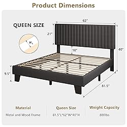 • The iPormis Queen Upholstered Bed Frame with Headboard redefines restful living by uniting robust engineering with thoughtful design, all crafted to deliver your most comfortable and aesthetically pleasing sleep experience. Built with reinforced wood slats, this sturdy platform Bed Frame confidently supports up to 800 pounds, while its wide legs distribute weight to ensure unwavering stability. This Dark Grey Bed Frame's foundation of strength is completed by its Upholstered Headboard, wrapped in plush, built-in sponge and durable linen. It offers cloud-like comfort complemented by minimalist vertical stripes that naturally elevate any room's décor, making this Upholstered Bed a centerpiece of style and function.Designed with your well-being in mind, the Queen Bed Frame's low 6-inch profile reduces fall risks and facilitates easy movement—ideal for children, seniors, and modern lifestyles. This practical Queen size Platform Bed frame height also accommodates a robot vacuum, merging safety with everyday convenience. To ensure uninterrupted tranquility, EVA noise-reducing strips and non-slip foot pads work together to eliminate squeaks and protect floors, preserving both peaceful sleep and your home.Completing this thoughtful Queen Bed Frame with Linen Headboard design, every component arrives in one box. With tool-free strap fasteners and intuitive assembly, two people can set up this Platform Bed with Upholstered Headboard in just 30 minutes. At iPormis, we are committed to creating pieces that not only provide supreme comfort but also resonate with your sense of style—making this Upholstered Bed a lasting addition to your home