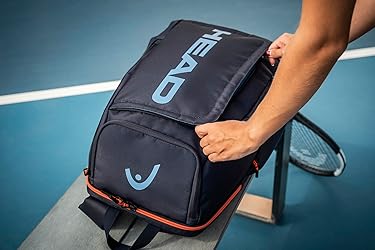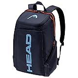 - A new navy design, with orange details, along with HEAD branding and the iconic wishbone logo, adds to the modern, urban look of the PRO BACKPACK 28L NV. The bag has a contemporary square shape and smart functionality. With access from both the top and the front, you can easily pack and unpack the main compartment, while you can carry up to 2 racquets in the inside compartment, which is padded for protection. Along with an integrated shoe compartment, the bag has zipper pockets at the front and sides while the backpack straps keep the bag tight to your body for ultimate carrying comfort. As an illustration of how HEAD is trying to reduce plastic usage, the hangtag is made from recycled paper and tied with hemp cord, and the bag is presented in a new recycled plastic bag.