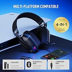 【4-in-1 Universal Connectivity】The EKSA G19BT wireless gaming headset supports 2.4GHz USB, Type-C wireless, Bluetooth 5.4, and 3.5mm wired modes, giving you flexible, reliable connectivity across multiple platforms. Easily switch between PC, laptop, Mac, PS4, PS5, Switch, and mobile devices, making it an ideal all-in-one headset for gaming, music, and everyday use. Note1: Bluetooth mode is not compatible with PS4/PS5. Note2: Note: Only the 3.5mm wired mode is compatible with Xbox Series X/S/One, while all other Xbox models are not supported. 【Ultra-Low Latency Performance】Experience smoother, more responsive gameplay with <30ms ultra-low-latency 2.4GHz wireless gaming headphones. From footsteps and gunfire to fast on-screen action, sound and visuals align instantly— ensuring you react faster in competitive battles without lag or audio delay. 【Immersive Stereo Sound with Gaming Mode & Muisc Mode】Powered by tuned 40mm drivers, the bluetooth gaming headset delivers clear highs, punchy bass, and accurate spatial detail. Switch instantly between game mode for precise sound positioning and low latency while music mode for fuller, richer audio. Perfect for competitive play, casual gaming, and everyday listening—all with one tap. 【Slot-In Noise-Cancelling Microphone】Lead every match with a flexible noise-canceling boom mic that minimizes background noise in intense gaming environments. Advanced noise-reduction technology keeps your voice clear and focused, so teammates catch every callout, footstep cue, and strategy update. When the mic isn’t needed, it folds neatly into the earcup for a clean, low-profile look—perfect for music, travel, or everyday use. 【169g Feather-Light & Ergonomic Comfort】Weighing just 169g, this pc headset is built for long gaming sessions without pressure or fatigue. Breathable mesh earpads improve airflow to reduce heat buildup, while the adjustable headband and foldable design provide a secure fit and make it easy to pack and carry wherever you game. 【Long-Lasting Battery with Fast Charge】The Power through long sessions with up to 35 hours of battery life. When you need a quick boost, fast-charge support delivers hours of use in just minutes, with a full charge taking only 2.5 hours via USB-C. Whether you're gaming on PC or mobile, this gaming headset keeps up without frequent charging interruptions. 【Subtle RGB. Smartly Placed.】The downward-facing RGB lighting creates a soft ambient glow that enhances your setup without pulling focus from the screen. Like a quiet signal in the dark, it adds atmosphere without distraction. One-button lighting control lets you switch effects instantly or turn RGB off entirely—for a refined balance of immersion, performance, and personality.