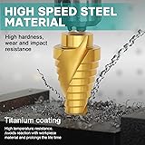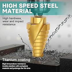 【50 Sizes in 5 Bits】One versatile step drill bit set gives you 50 essential hole sizes (3/16" to 1-3/8") for any project. Perfect as a step drill bit set for metal, wood, plastic and more - no more searching through bulky collections 【Titanium-Coated HSS - Drills Harder, Lasts Longer】High-speed steel core with titanium nitride coating provides extreme heat and abrasion resistance. These step drill bits for metal maintain sharpness through stainless steel, aluminum, iron, and other tough materials 【Spiral Flute & 118° Tip - Precision Meets Performance】Dual-spiral flute design ejects chips rapidly for cooler operation and cleaner holes. Combined with the 118° split point tip that self-centers and prevents walking, you get professional results even on curved surfaces 【1/4" Hex Shank - Instant Compatibility & Maximum Grip】Ready for any drill or impact driver with its standard 1/4" hex shank. The step bit for impact driver ensures secure grip without slippage, while quick-change capability saves time on every project 【Complete in Aluminum Case - Organized & Portable】All 5 HSS titanium step drill bits come in a durable aluminum storage case (6"×4.45"×1.7"). Keep your workshop tidy and carry your step up drill bit for metal anywhere - ideal for contractors and DIY lovers alike