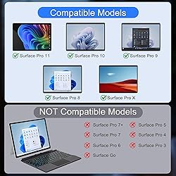 Important - Surface pro wireless keyboard is only compatible for Surface Pro 11/Pro 10 /Pro 9/Pro 8/Pro X, not compatible for Surface Pro 7 / 7 + /6 /5 /4 /3, Surface Go 4/3/2/1,Surface Book. Steps to confirm your device model: Settings - System - About 7 Colors Backlight + 3 Levels of Brightness - This surface pro 11 bluetooth keyboard has 7 colors of backlight and 3 levels of brightness to choose from, whether in a dark light environment or in daily use, just gently press the brightness adjustment button on the keyboard to select the appropriate backlight color and brightness, and you can start creating immediately, reducing eye fatigue and misuse due to insufficient light, and making our work more efficient and comfortable, especially suitab Magenitic Angle Adjustment & Ergonomical - Surface pro 11 wireless keyboard backlit are ergonomically designed to magnetically adjust the proper keyboard angle for a more comfortable typing and viewing experience. The right keyboard angle for artists and creative workers allows them to maintain a comfortable posture and focus on inspiration during the creative process, reducing fatigue and increasing efficiency and accuracy. (Keyboard can also be detached for remote operation) Sensitive Touchpad & Palm Rejection - The sensitive touchpad of surface pro 9 bluetooth keyboard can realize fast response and support multi-touch technology, gesture quick operation, which greatly improves the operation efficiency. And with the palm-anti-touch function of the touchpad, users can rest assured that they can place their palms on the keyboard to ensure that they will not unintentionally touch the touchpad, creating unnecessary cursor movement or other mis-operations, which will aff Bluetooth Quick Connect - This surface pro 9 wireless keyboard supports Bluetooth pairing within 10 meters, long press Fn+Z for 3 seconds to enter pairing status. And the Bluetooth connection is highly stable, making it easy to operate, whether you're giving a presentation in a conference room or using your laptop from the comfort of your couch. In addition, the keyboard is thin and lightweight at only 365G, allowing for easy portability.