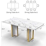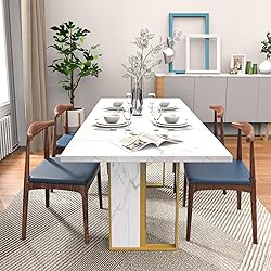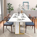 Morden Design: This large rectangular kitchen table features delicate lines and a simple yet stylish design. The tabletop utilizes a marble white and gold color block design to add a touch of color to your home. Whether you prefer a farmhouse look, modern aesthetics, or other unique styles, this white wood-grain dining table can complement a variety of decorative themes. Large Enough for 4 to 8 People: Large Dining Table size with 71" W x 31.5" D x 30" H. The 71-inch rectangular dining table is designed with the perfect dimensions to accommodate 4-8 people comfortably. Whether you're hosting a family gathering or a dinner party with friends, this rectangular dining table is the perfect ideal. Durable & Sturdy Construction: Made from a 1.2" MDF wood that has been carefully selected for its durability and strength, waterproof surface that will withstand daily use. What's more, the frame is constructed from wood+iron materials which ensures strong stability for long-term use. The load-bearing capacity of 350 lbs. Engineered for Stability: This 6-person dining table is equipped with Heavy-duty H-shaped center support + widened wooden legs + metal feet, providing unprecedented support and excellent stability. Specially designed anti slip foot pads can effectively protect your floor from scratches when moving this industrial dining table, allowing you to enjoy dinner with peace of mind. Easy to Assemble: Designed for simple assembly, this kitchen & dining table comes with detailed instructions and complete tools. All parts and screws are labeled with matching numbers, so you can finish installation smoothly without hassle. Ideal for DIY enthusiasts.
